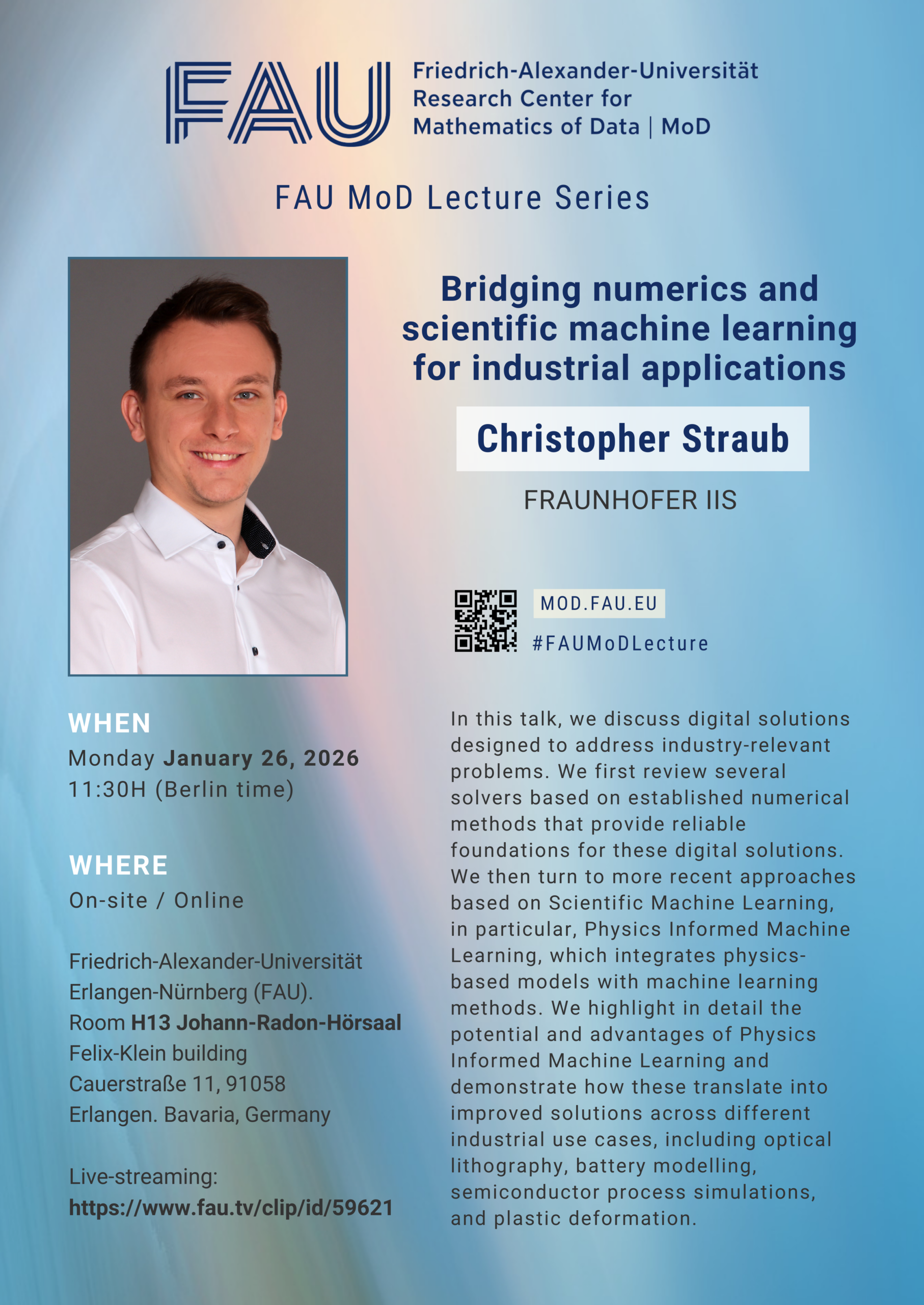 • FAU MoD Lecture: FAU MoD Lecture. Special December 2024 by Prof. Dr. Holger Rauhut and Prof. Dr. Christian Bär