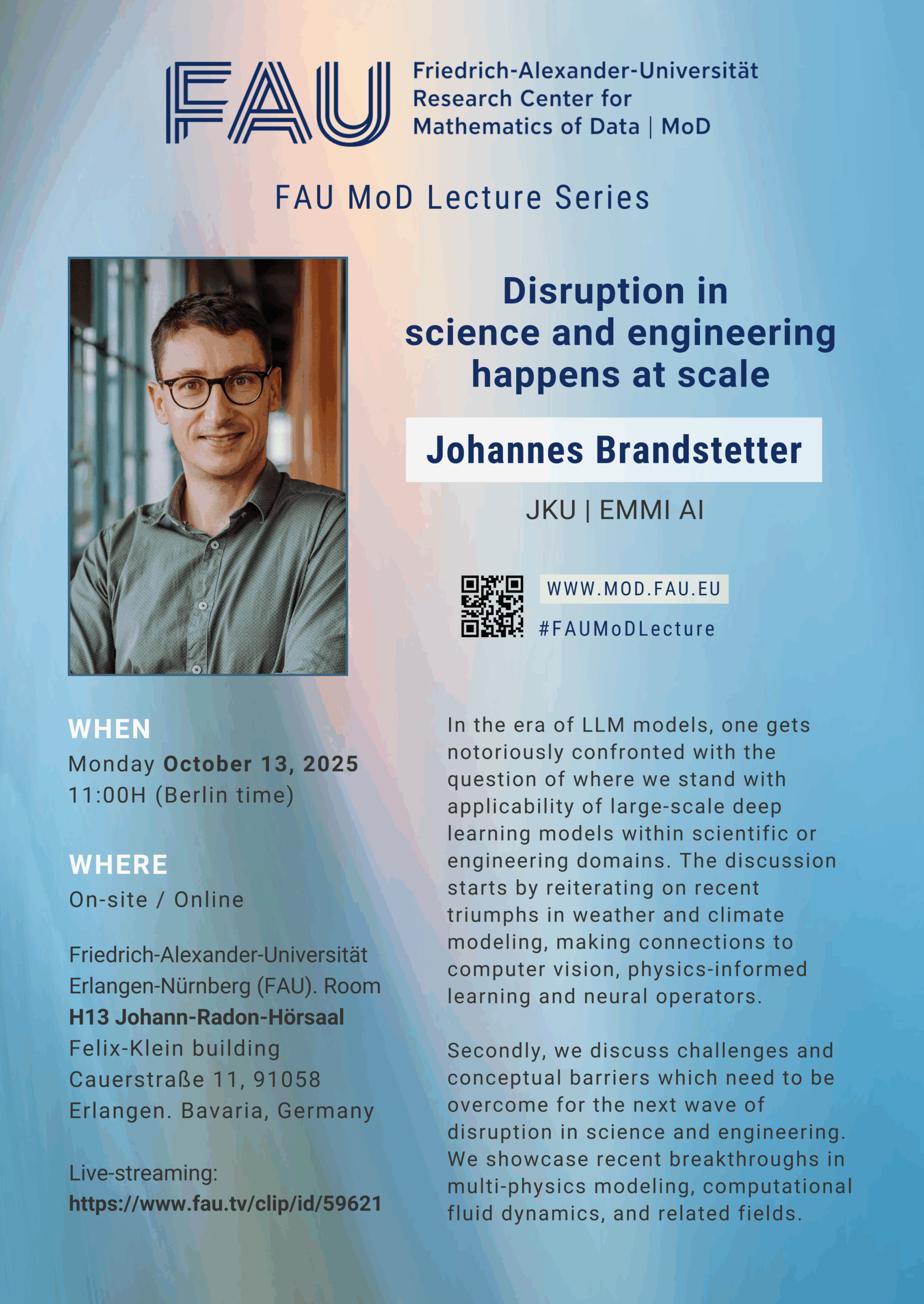 Johannes Brandstetter is an Associate Professor at Johannes Kepler University (JKU) in Linz and Co-founder and Chief Scientist at Emmi AI. He did his PhD studying Higgs boson decays at the CMS experiment at the Large Hadron Collider at CERN. In 2018, he joined Sepp Hochreiter’s group in Linz, Austria. He was an ELLIS Fellow at Max Welling’s lab at the University of Amsterdam, before joining the newly founded Microsoft Lab in Amsterdam. During his time at Microsoft Research, Johannes was working on scaling up of AI driven physics surrogates, most notably for weather and climate simulations. In October 2023, he started a new group “AI for data-driven simulations” at the Institute of Machine Learning at the Johannes Kepler University in Linz. Early 2025, he co-founded Emmi AI in where he is currently is the Chief Scientist.
