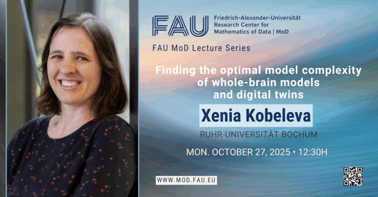 Date: Mon. October 27, 2025 Event: FAU MoD Lecture Organized by: FAU MoD, the Research Center for Mathematics of Data at Friedrich-Alexander-Universität Erlangen-Nürnberg (Germany) FAU MoD Lecture: Finding the optimal model complexity of whole-brain models and digital twins Speaker: Prof. Dr. Xenia Kobeleva Affiliation: Department of Neurostimulation, Ruhr-Universität Bochum (Germany) Abstract. Whole-brain neural mass models …